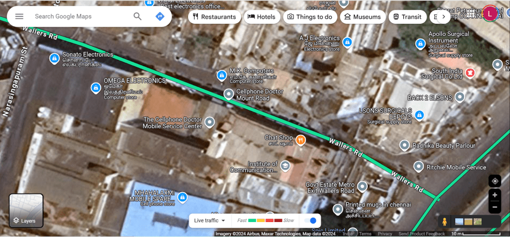 Left devastated by the incident, I soon reached out to my friends, and one suggested taking it to his ‘tech’ friend, studying at IIT Madras, who refused to retrieve it as it was an impossible task for him to do. Another reference was taking it to ‘Cellphone Doctor’ located on Ritchie Street. Being very certain that it’s impossible to fix up the body parts, the maximum one could try is to retrieve its soul (phone data) with all the memories it had stored up in it. I reached Ritchie Street, which is famous in Chennai for its cheaper phone services and electronic items, where you will get your work done in one or the other shop. Carrying that hope, I entered Wallers Road, and soon I spotted ‘The Cellphone Doctor’ shop on my left, but the Google map directed me to walk further, taking a right from the police booth, which is a prominent landmark in the area. However, I found another ‘Cellphone Doctor’ shop within a few meters on my right side. Many had tried to pull me into their shop, but I wasn’t in the free state of mind to explore and find the best service shops, as in that critical situation, my phone needed a ‘doctor’. To avoid the delay in searching for it further, I decided to take it to a ‘Cellphone Doctor’ shop located closer by, it was too small and narrow in size, but that didn’t matter for the service it provides. Even a foot-sized space on Ritchie Street has a rental value, and trespassing the line would spark the heat with the next person’s shop. The service person later shared that their shop was the oldest one to have this name, later it got appropriated by a few others by adding “the” in front of Cellphone Doctor so we couldn’t fight against it.