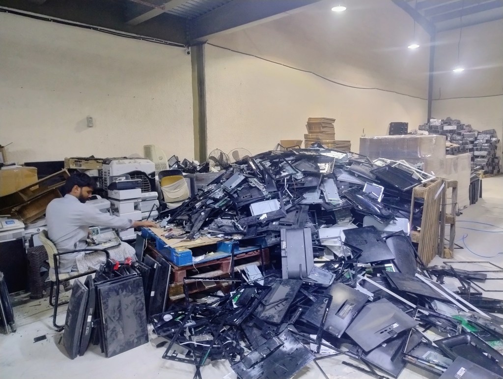 My colleague, Dr. Gayatri Rathore, told Vijay and me that we were walking along a street of second-hand electronics warehouses. Inside, Urdu filled the air. We could hear snippets of instructions, jokes, and half-shouted conversations, while the clatter of dismantling never stopped. A young man in a Pathani salwar was prising apart LED screens from computer casings with a quick, sure swing of his arm. He is paid one dirham, about twenty-five rupees, for every panel he separates. The boards he discards pile up in front of him. Two others, in faded, dusty T-shirts and trousers, paused to watch us warily at first, mistaking us perhaps for some kind of inspection team.