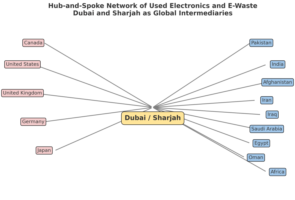 By around 10:30 PM, after six lengthy conversations and perhaps 7 to 8 cups of tea, in what everyone here refers to as Areas 2, 5, and 6, a pattern began to emerge: the devices surrounding us came from OECD countries and Japan. They were routed to Sharjah as if this location were a vast workshop or refurbishment laboratory, where the afterlife of discarded devices begins. That night, around 11.30 p.m., after dinner at an Afghan restaurant near the JNP signal, I looked back on the day. Sharjah revealed itself to me not as a “periphery” or an “edge”, but as one of the global intermediaries of the e-waste trade, entangled in transnational urban productions that begin far from the sleek towers of Dubai.