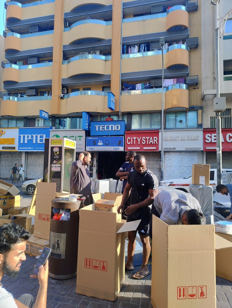 Alongside these long-established Malayali networks, new territorialities are reshaping the Naif market. One alley is now almost entirely lined with Chinese retailers selling Chinese-brand mobiles. During our visit, many of these shops were closed for the three-day Chinese New Year, but even this brief fieldwork revealed a strong Chinese presence that has grown noticeably after COVID-19. A Chinese retailer explained that their main customers come from the African continent, and that phones are customised to suit African markets. On the pavements outside, the everyday rhythms of circulation are visible: large cartons of mobiles are sorted, sealed, and stacked for shipping. Many shipping agents have no formal offices, just a concrete slab to sit on, a messenger bag across their shoulder, and a phone in hand as they coordinate dispatches. Two such agents we met were arranging shipments to Sudan, Tanzania, Uganda, Zambia, and Zimbabwe. To attract African buyers, non-African shop owners often employ an African shopkeeper as the familiar face of their business. These scenes extend the territorial mosaic of Dubai’s electronics markets, showing how ethnicity creates entanglements and transnational urban corridors linking Naif’s narrow alleys to African cities.