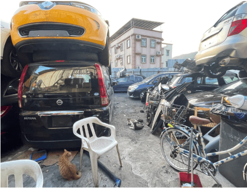 The vast area of Pat Heung consisted of numerous “open storages”, an official term used by the Planning Department. The New Territories were undergoing a profound transformation after a 1982 court ruling allowed agricultural land to be used for non-agricultural purposes, provided no permanent structures were built (Merry, 2020; Nissim, 2021). This legal shift catalysed the proliferation of warehouses, container yards, scrapyards, and repair workshops across the countryside. Extended urbanisation accelerated in Yuen Long, with more private housing and condominiums being developed. Pat Heung also became integrated into the metropolitan area with the opening of Tai Lam Tunnel in 1998 and the West Rail line in 2003, however it developed in a different way. This vast agricultural region evolved into numerous open-air rental spaces for vehicles and large heavy machinery, established on both individual plots and ancestral communal landholdings (祖堂 t’so t’ong).